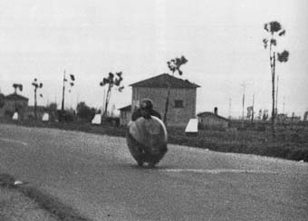 È Romolo Ferri a guidare la Lambretta carenata nel tentativo che ha luogo sabato 14 aprile sul lungo rettifilo della "fettuccia di Terracina", un tratto della via Appia in prossimita' di questa città. Ragioni di viabilità limitano la chiusura del tratto stradale a due ore, dalle 8 alle 10 ma il tempo non promette nulla di buono. Alla fine si decide di tentare ugualmente anche se ormai è tardi.